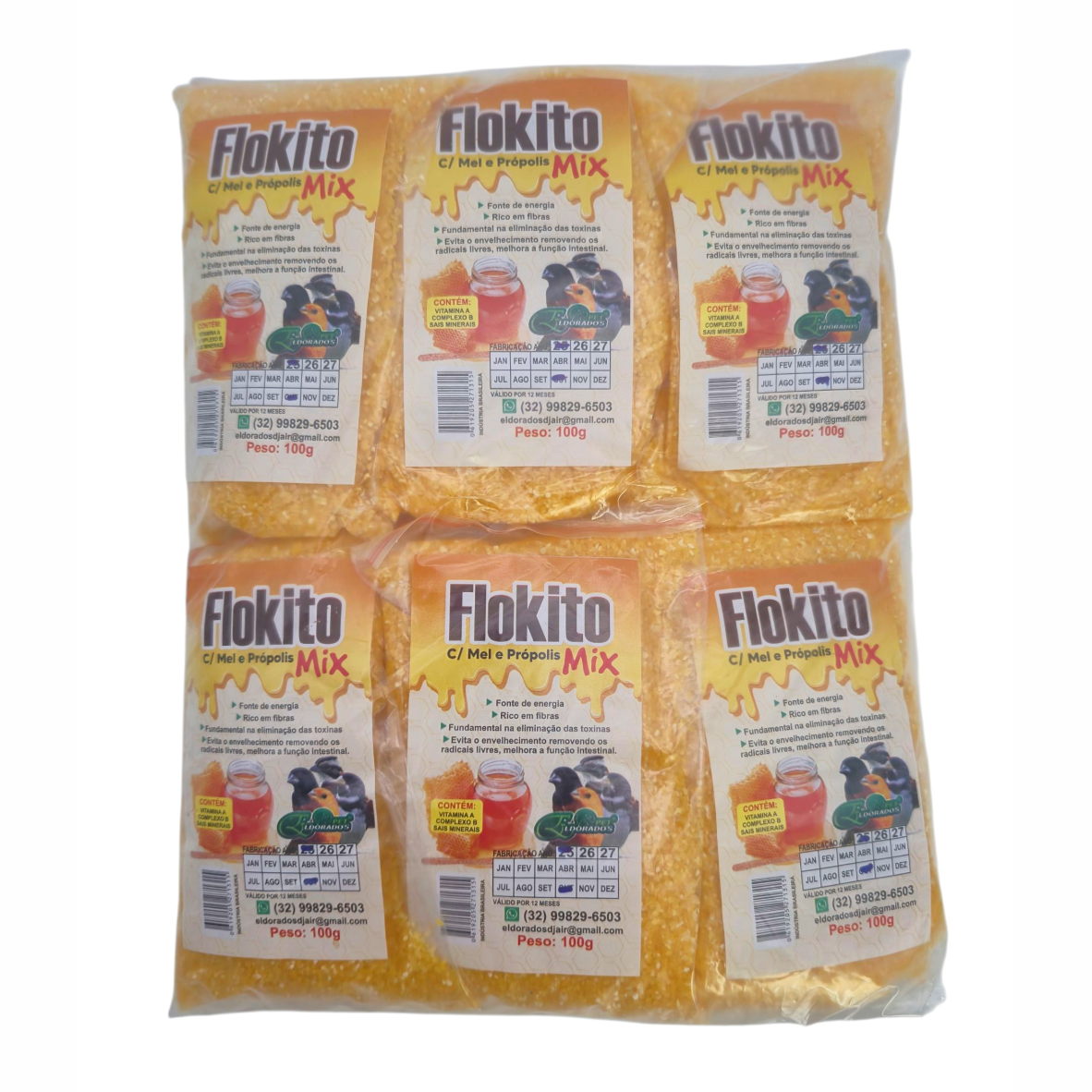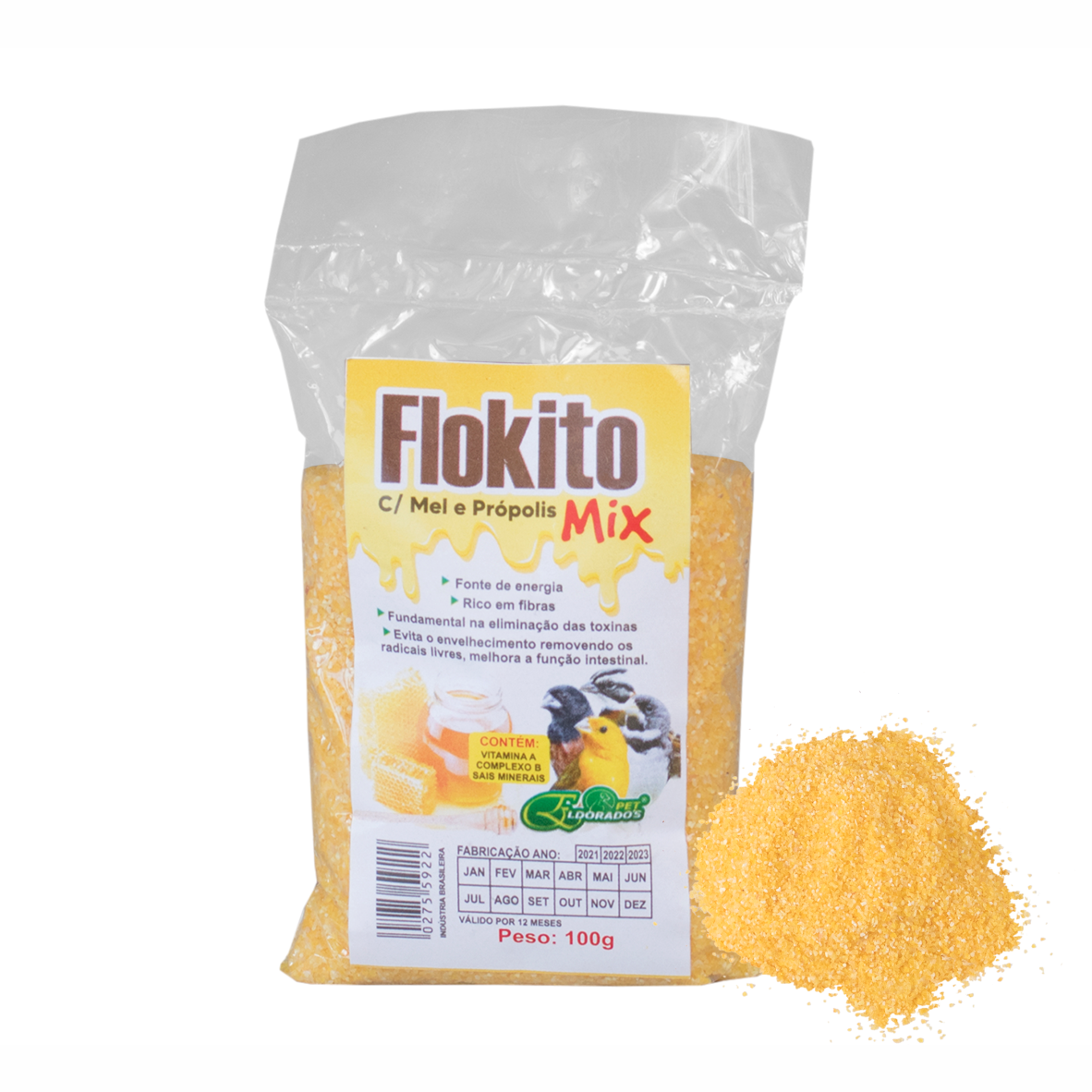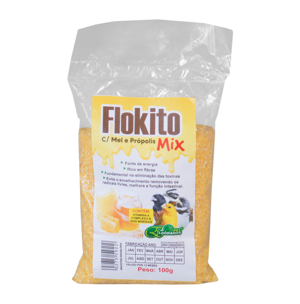 Descrição do Produto: Flokito com Mel e Própolis 100g é um petisco natural e nutritivo, desenvolvido para aves.