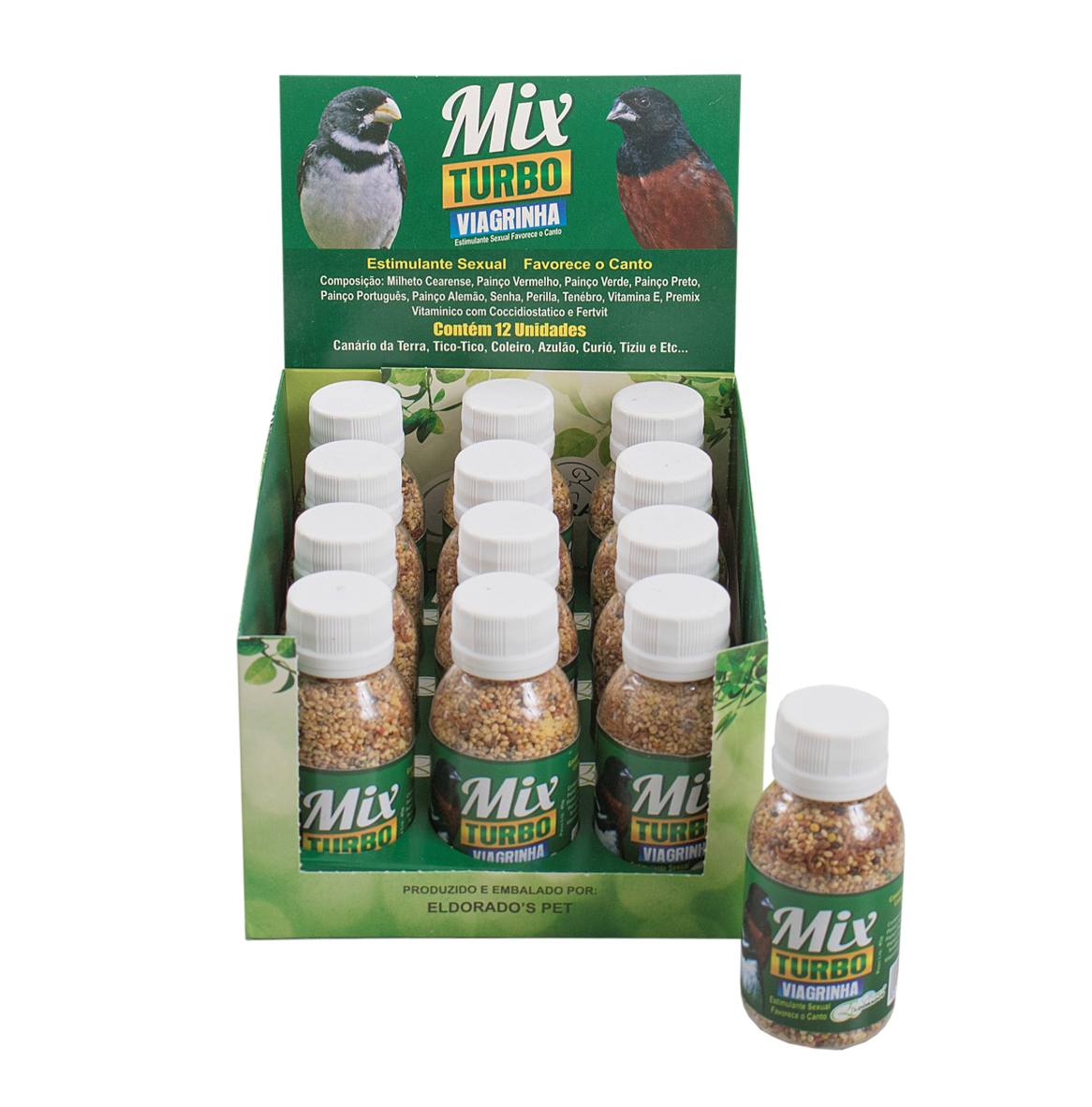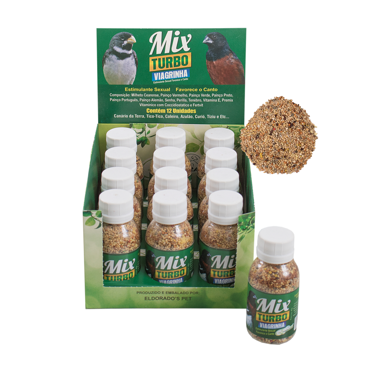Descrição do Produto: Mix Turbo Viagrinha Pote Caixa, Para coleiros,Tzil,canario da terra,tico tico,azulão,curio entre outros.